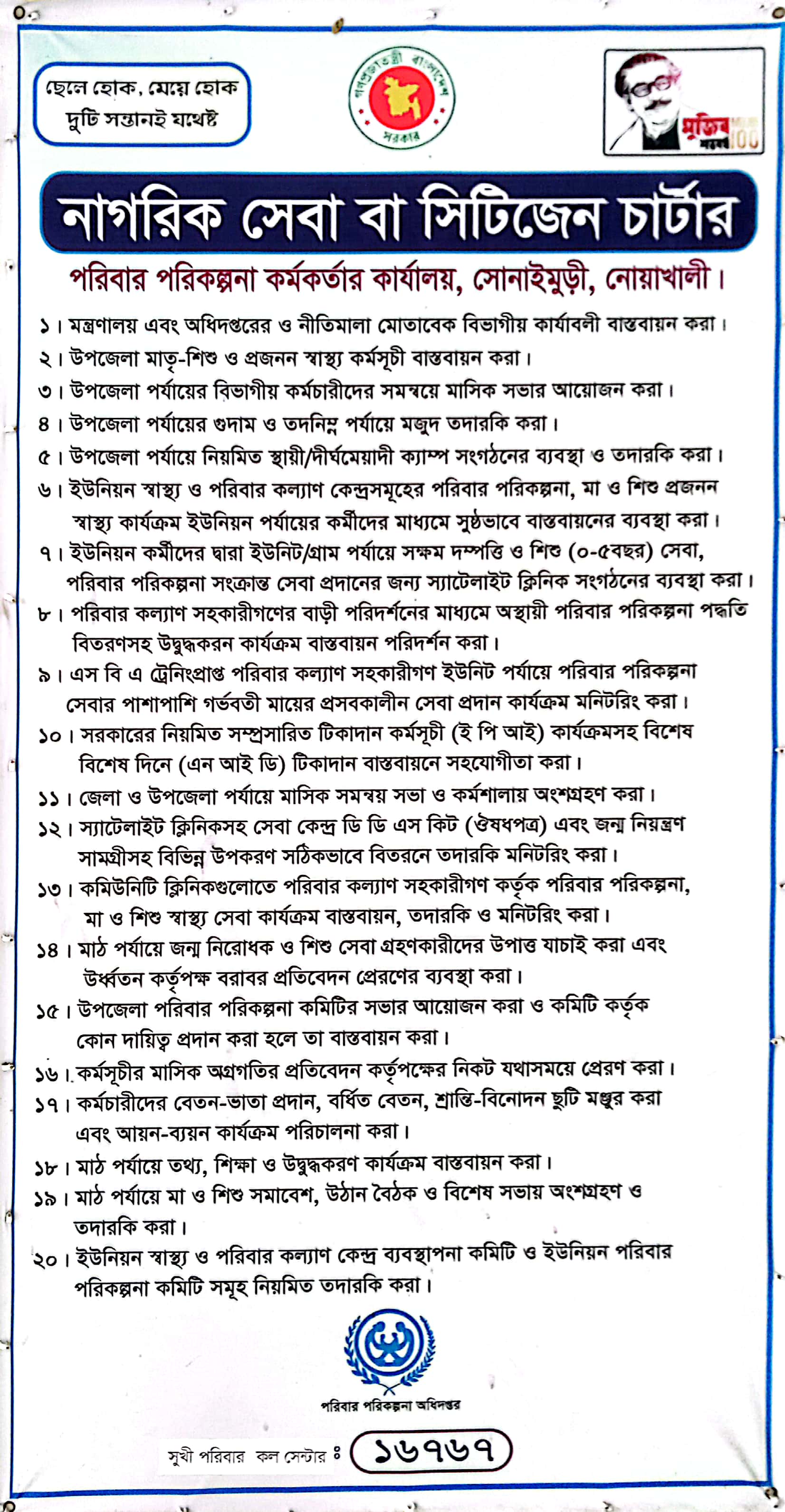 | বিনামূল্যে। | FWA,FWVএর ক্ষেত্রে মেডিকেল আফিসার এম সি এইচ (এফ পি)/ উপজেলা পঃ পঃ আফিসার এর কাছে অন্যন্য ক্ষেত্রে উপ-পরিচালক/ সহকারী পরিচালক (সি সি) বরাবর আভিযোগ করবেন। |